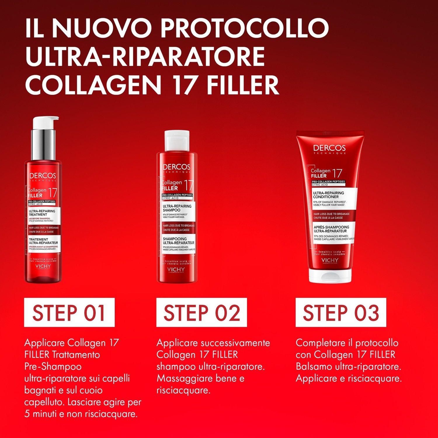 Completare il protocollo con Collagen 17 FILLER Balsamo ultra-riparatore. Applicare e risciacquare