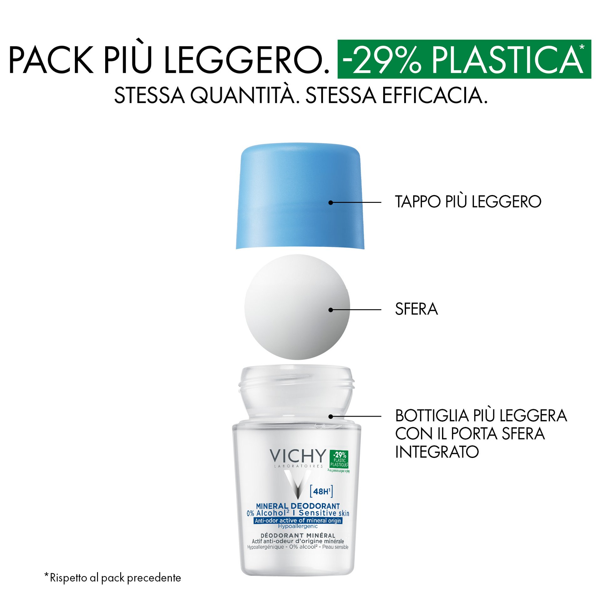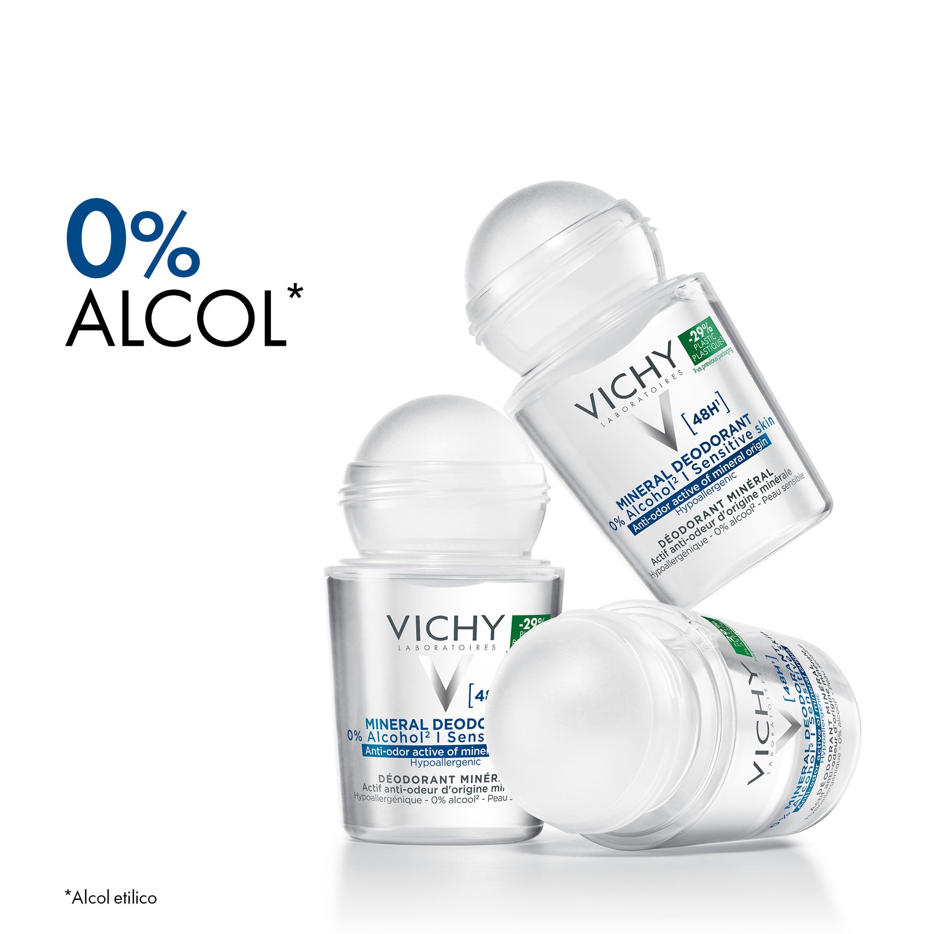 - Vichy Deodorante Minerale 48H formulato con ingredienti di origine naturale per 48H di protezione dagli odori. Testato sotto controllo dermatologico, sulla pelle sensibile. Formula ipoallergenica. Senza alcol*.