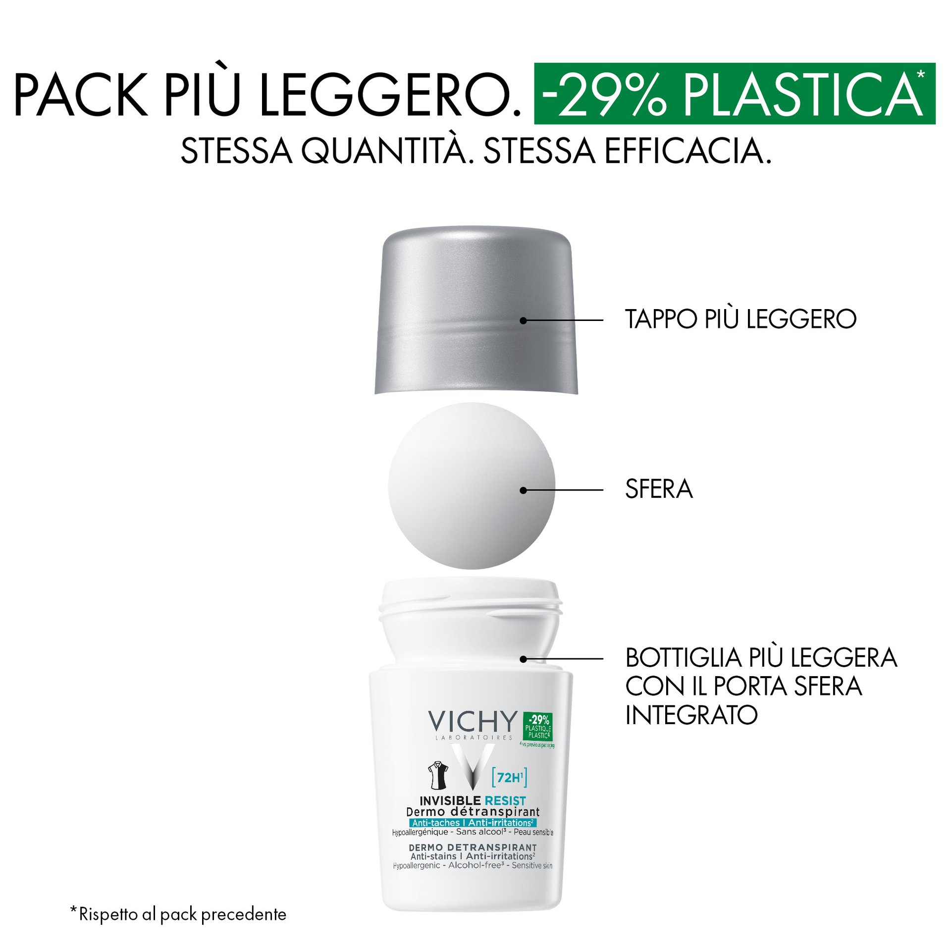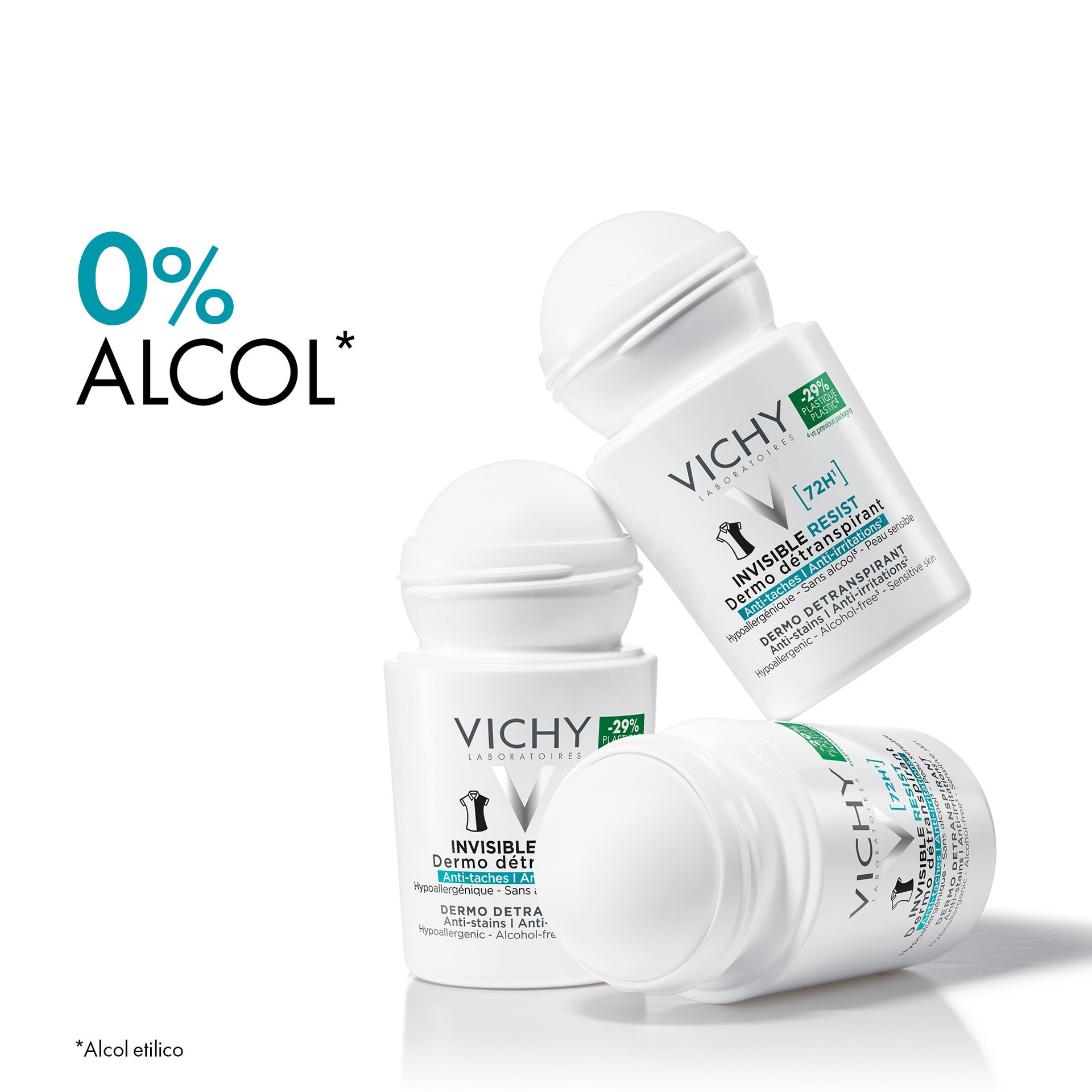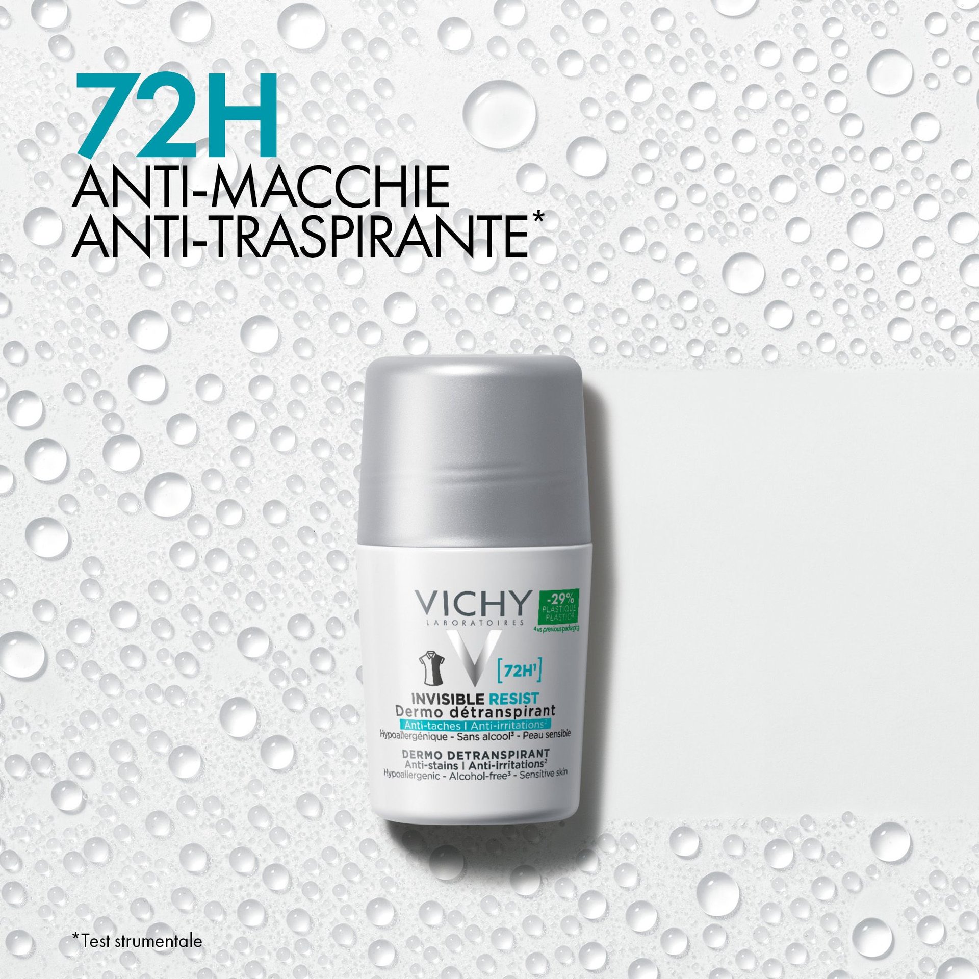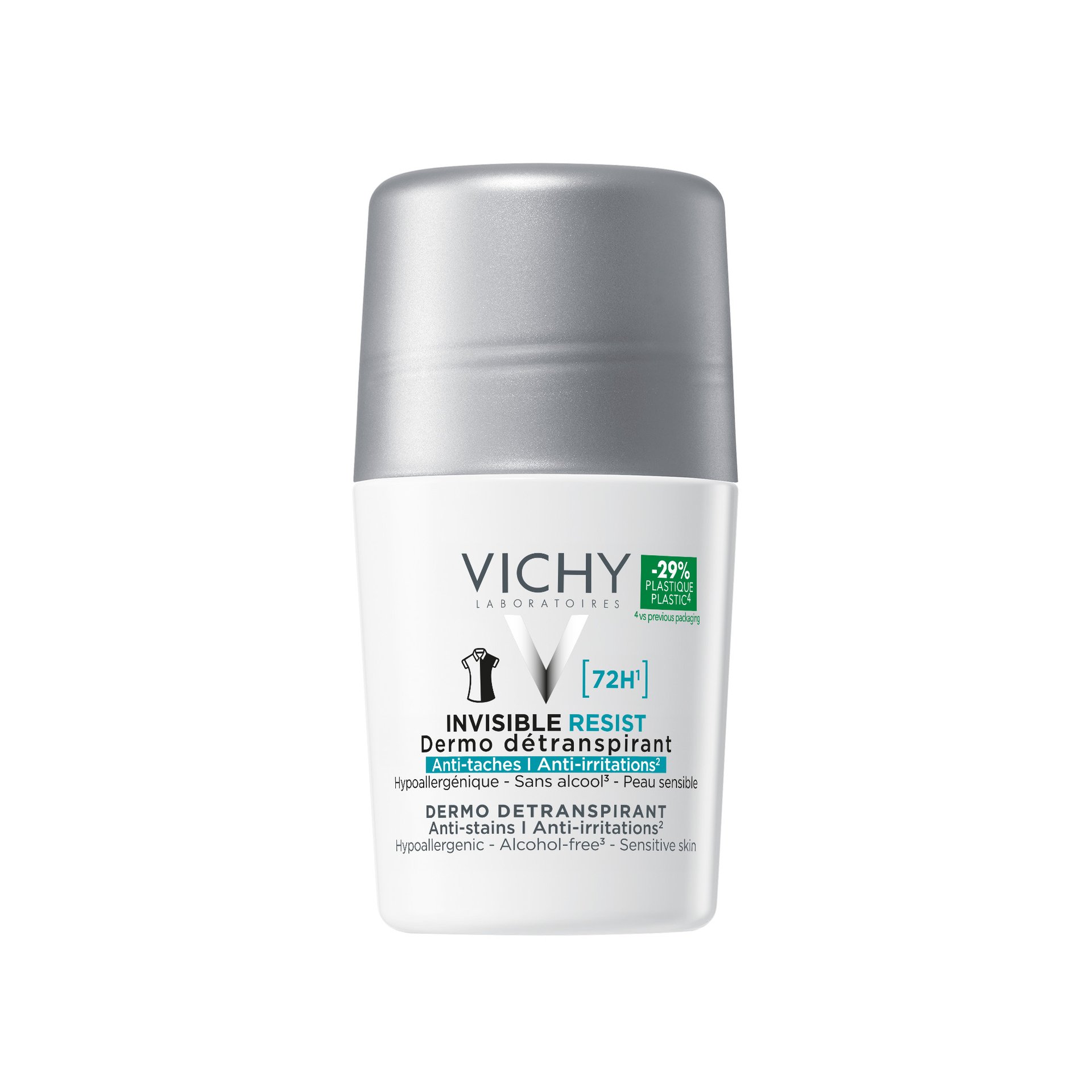 - Vichy Invisible Resist 72H Dermo Deodorante Antitraspirante fornisce una protezione di lunga durata per 72 ore contro il sudore e gli odori. Non lascia alcun alone nè macchie gialle. Testato sotto controllo dermatologico, sulla pelle sensibile. Formula ipoallergenica. Senza alcool*. 50ml.