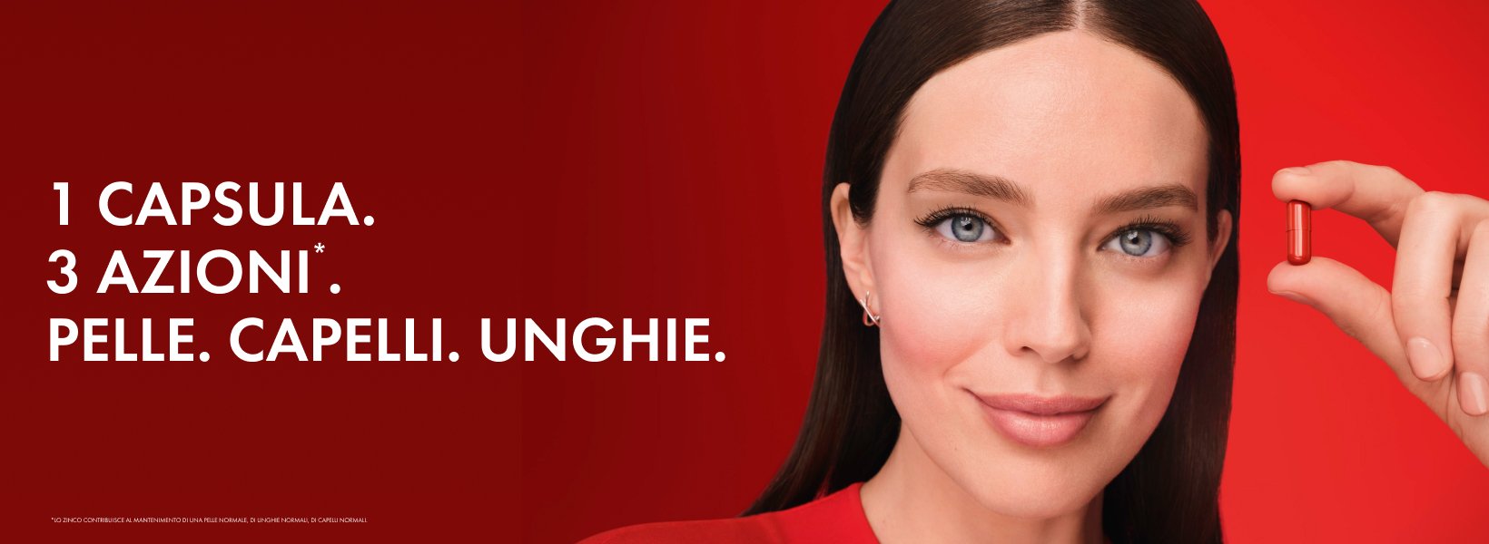 1 capsula, 3 azioni*: Pelle, Capelli, Unghie. Clinicamente testato**.