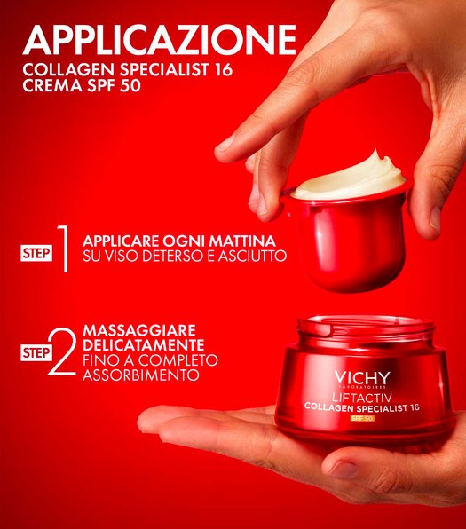 L'esposizione quotidiana ai raggi UV e l'avanzare dell'età causano la degradazione del collagene. Liftactiv Collagen Specialist 16 Crema con SPF50 corregge 16 segni dell'età1, migliorando: Rughe, Linee sottili, Compattezza, Volume, Cedimento, Levigatezza, Texture, Tonicità, Definizione, Rigenerazione cutanea, Luminosità, Morbidezza, Struttura, Idratazione, Vitalità, Uniformità. Ora arricchita con SPF 50, fornisce alla pelle una protezione quotidiana dai raggi UV.