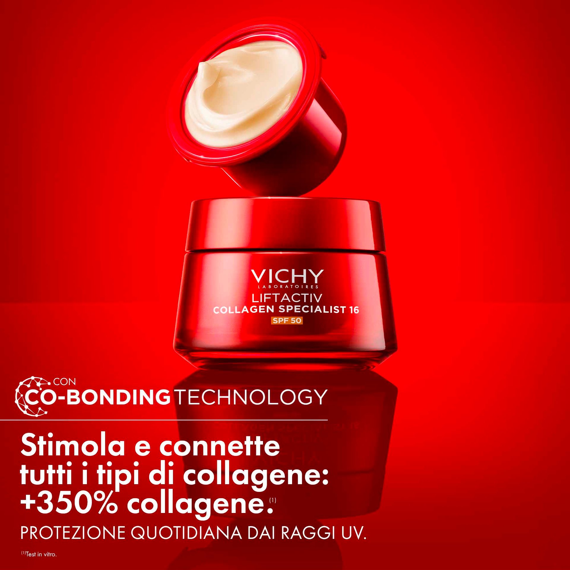 Con Co-Bonding Technology, che stimola e connette tutti i tipi di collagene, per +350% Collagene*. Protegge dai raggi UV. *Test in vitro.