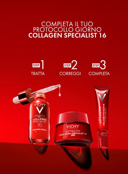 La scienza dietro una pelle dall’aspetto giovane? Non è 1, ma 16 tipi di collagene. La gamma rinnovata Vichy Collagen Specialist 16 con Co-Bonding Technology (Ramnosio+Peptidi+Maitake) attivo che stimola e connette tutti i tipi di collagene* per una matrice del collagene rinforzata. Questa formula corregge 16 segni dell’età**.