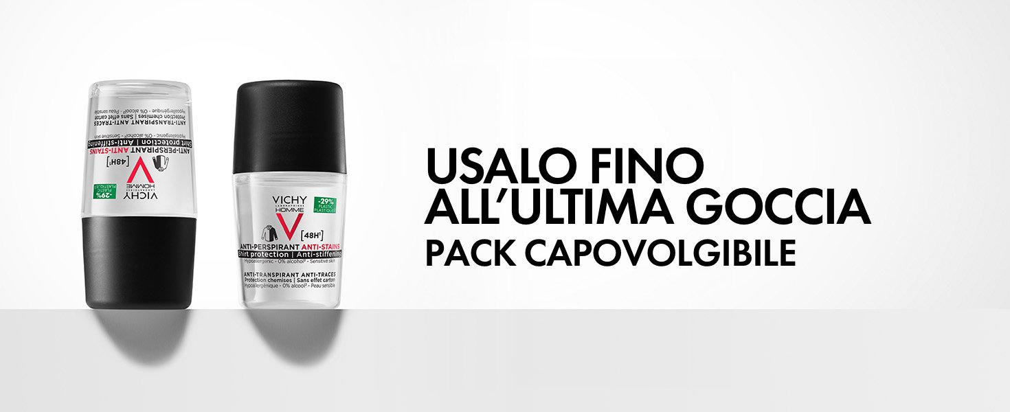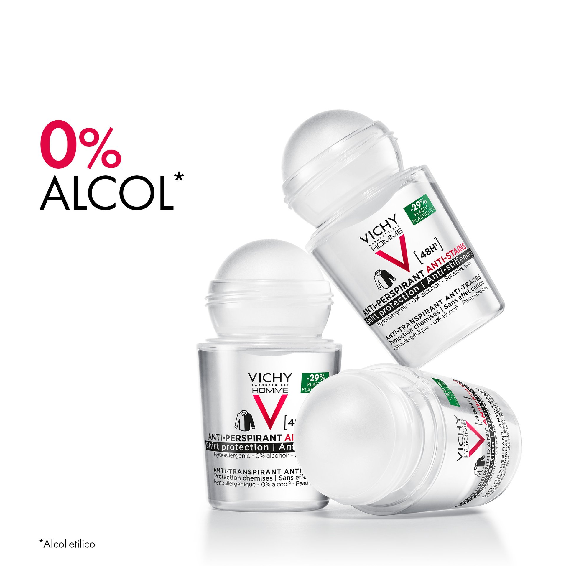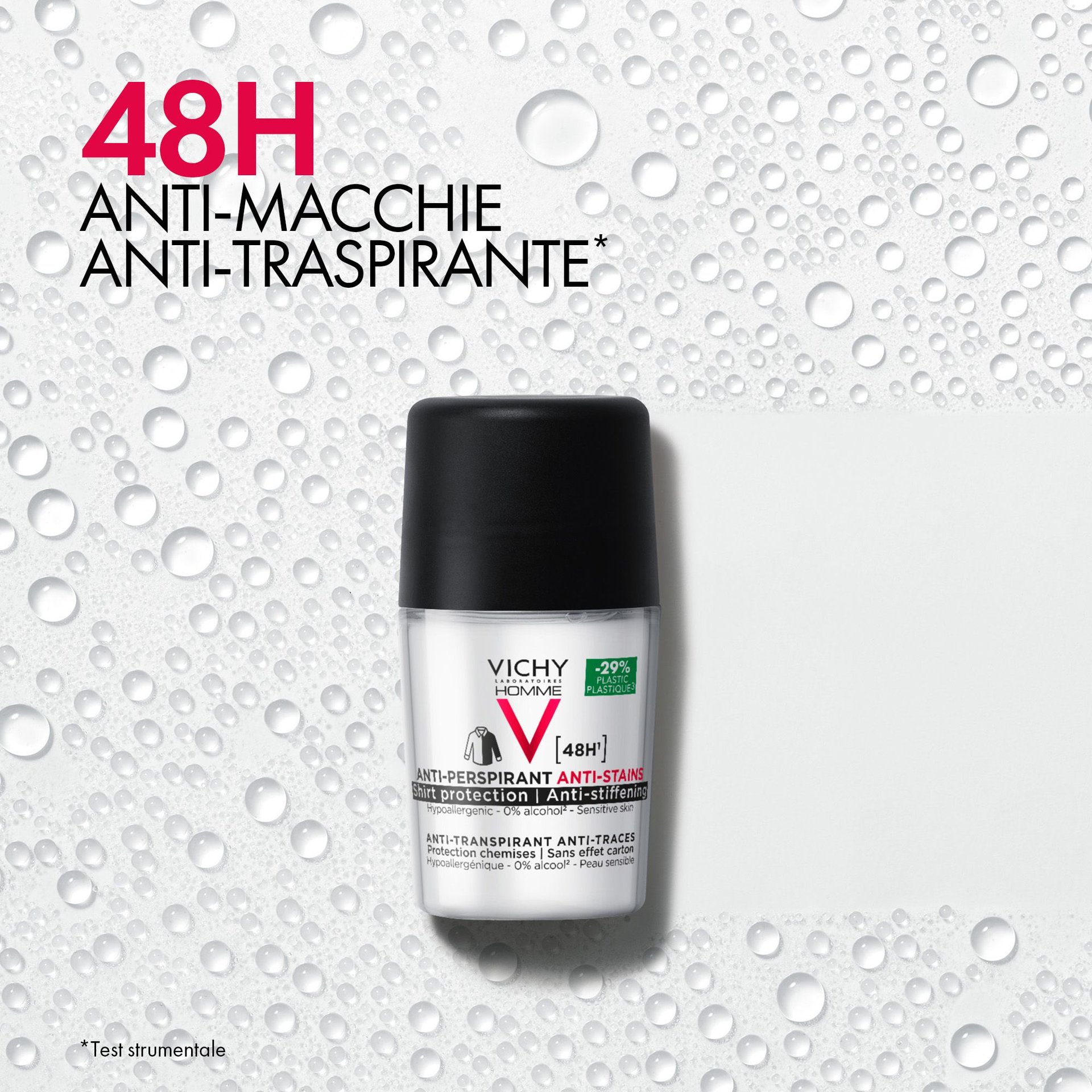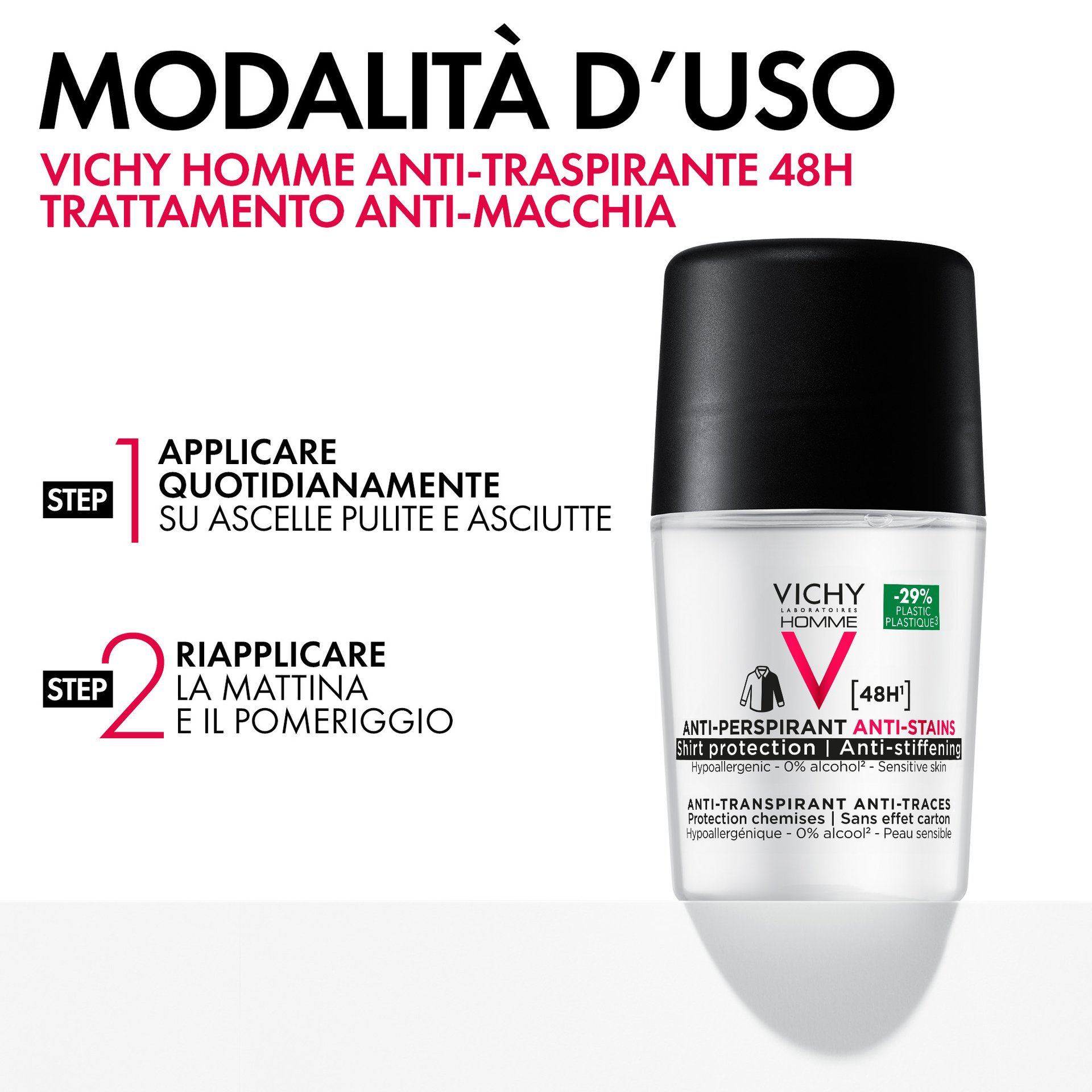 - Vichy Homme Anti-traspirante 48H Anti-macchie offre una protezione di 48 ore contro sudore e odore. Senza macchie bianche, senza macchie gialle. Testato sotto controllo dermatologico, su pelle sensibile. Formula ipoallergenica. Senza alcol*.