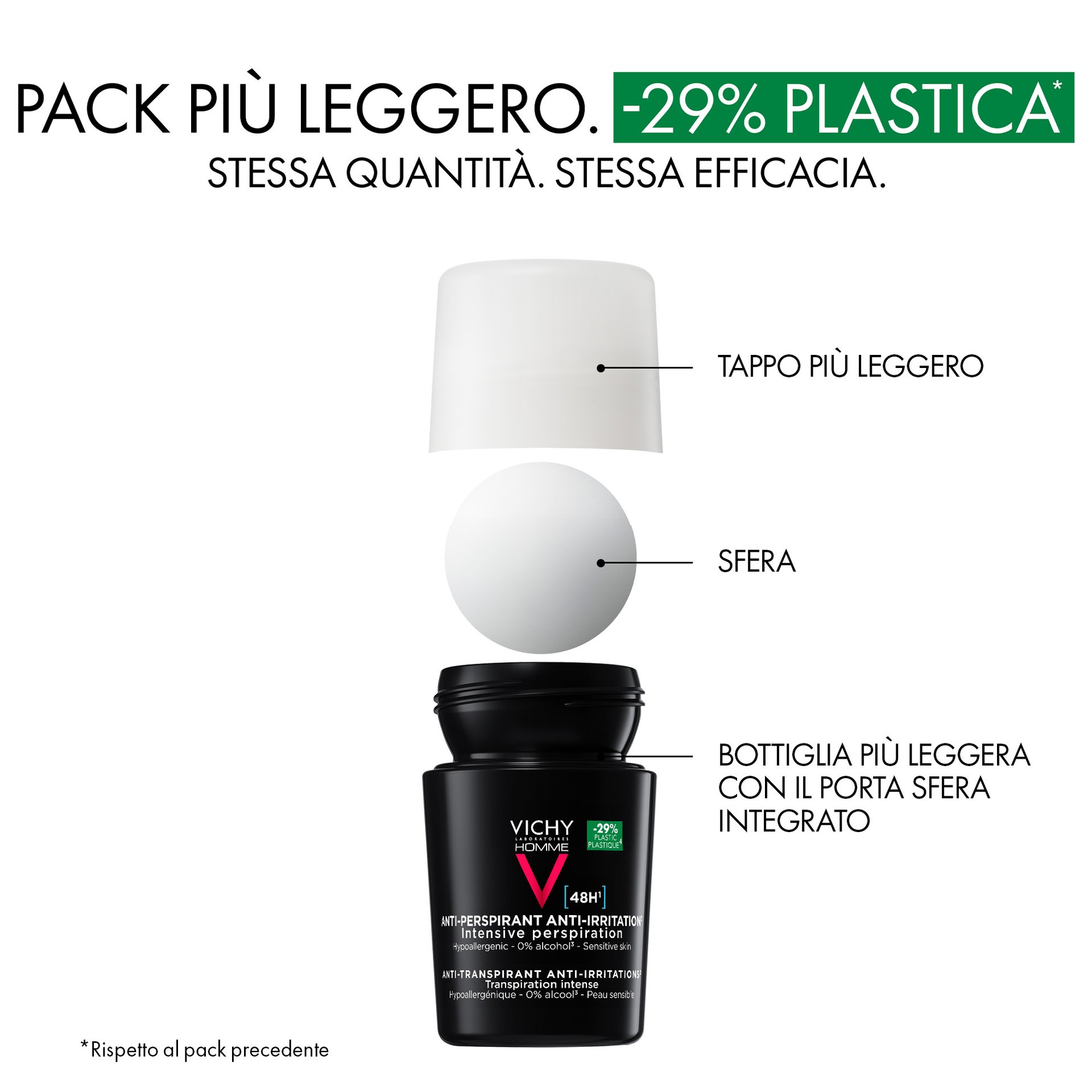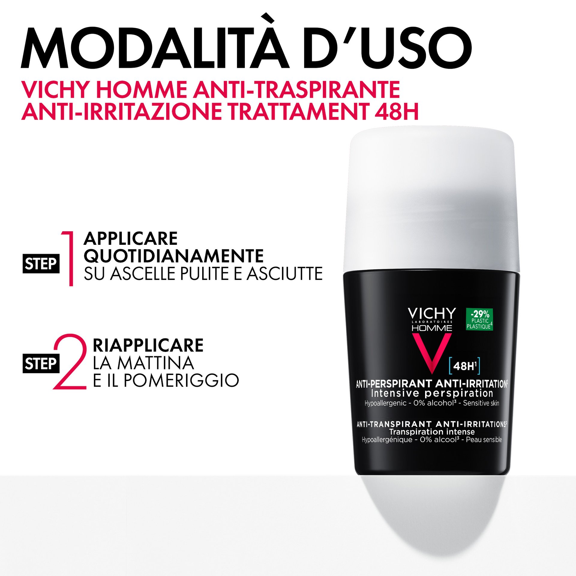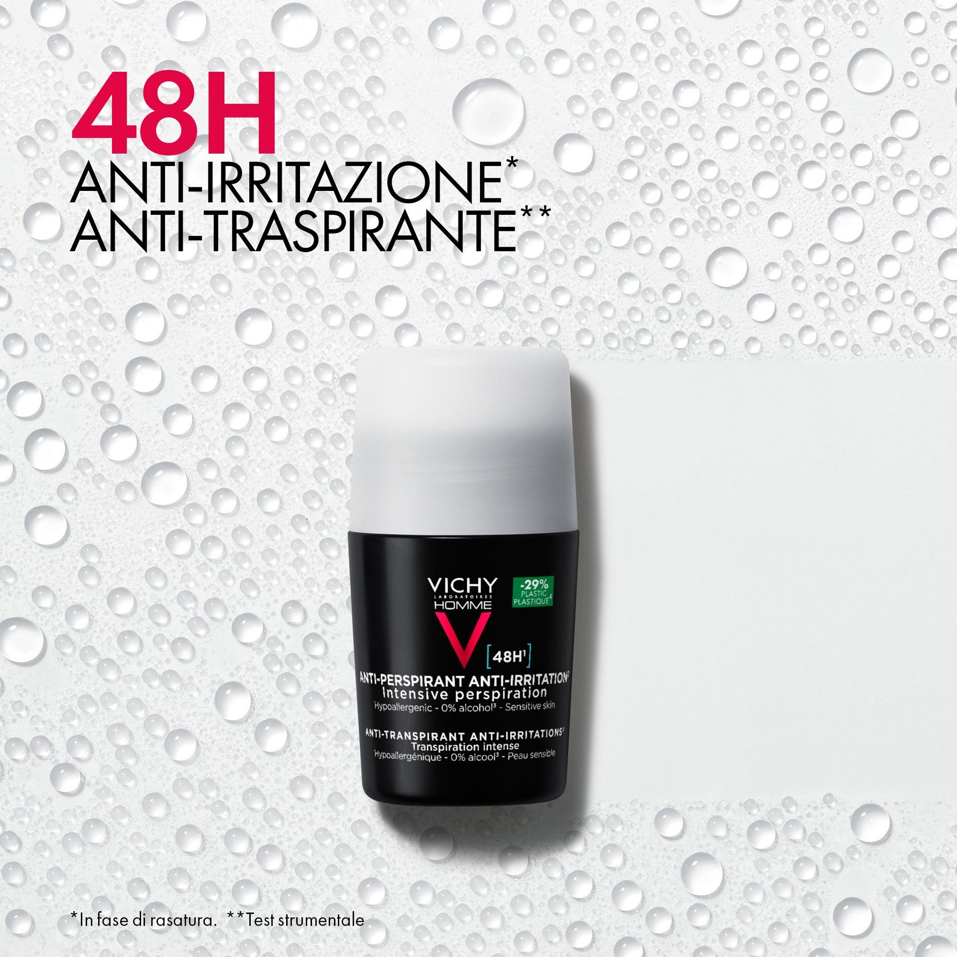 - Vichy Homme Trattamento Anti-traspirante & Anti-irritazione 48H fornisce 48 ore di protezione da sudore e odori. Anti-irritazione. Testato sotto controllo dermatologico, su pelle sensibile. Formula ipoallergenica. Senza alcol*. 50ml.