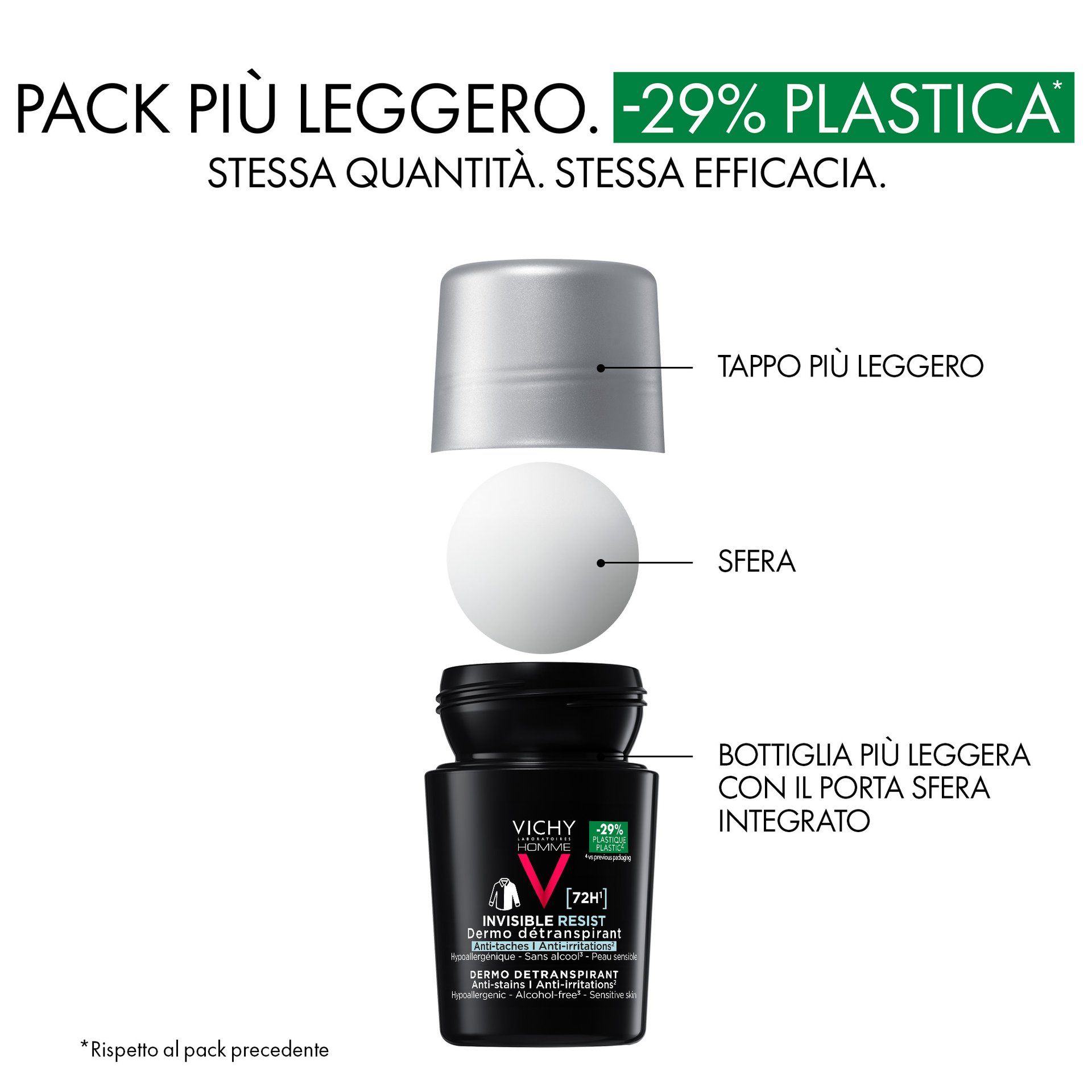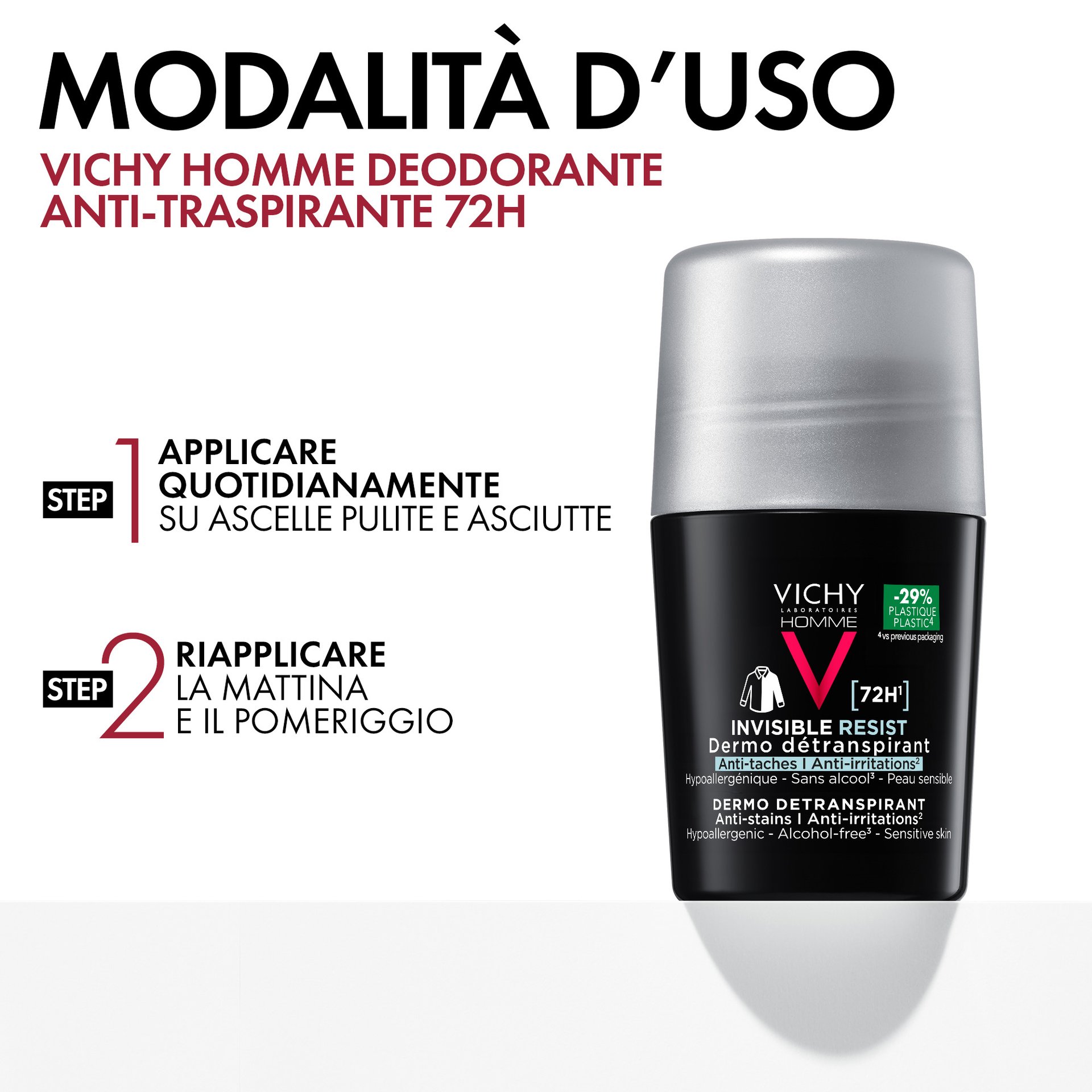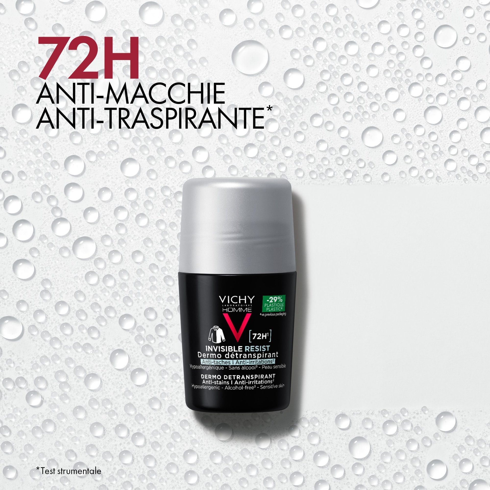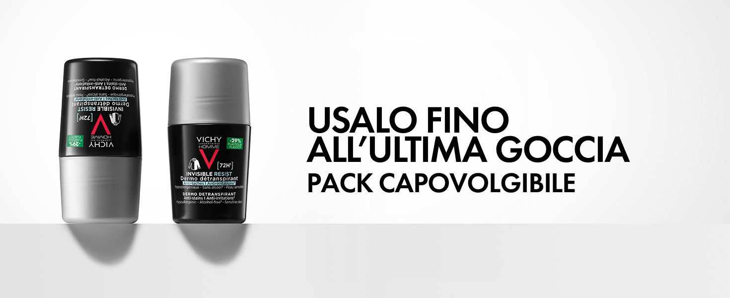 - Vichy Homme Invisible Resist 72H Dermo Detraspirante offre 72 ore di protezione a lunga durata da sudore e odori. Non lascia segni, nè macchie gialle. Testato sotto controllo dermatologico, su pelle sensibile. Formula ipoallergenica. Senza alcol*. 50ml.